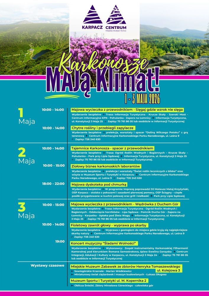 - 10:00 – 15:00 | Majowa wycieczka z przewodnikiem: „Wędrówka z Duchem Gór”, Trasa: Informacja Turystyczna – Ogród Roślin Wodnych i Bagiennych – Odsłonięcie hornfelsów – Lipa Sądowa – Pomnik Ducha Gór – Zapora na Łomnicy – Karpatka – Apteka pod Złotą Wagą. Start: Informacja Turystyczna, ul. Konstytucji 3 Maja 25. Zapisy: 75 761 86 05 lub osobiście.