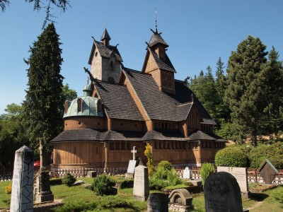 Nach kurzer Erholung brechen wir weiter aufwärts auf. Von hier ist es wirklich nicht mehr weit zu der Stabkirche Wang. Wir gelangen wieder zu der Karkonoska Straße und gehen weiter die Straße entlang aufwärts. Wir gelangen zu einer Pflastersteinstraße Na Snieżkę, in die wir abbiegen müssen. Es ist ein Transportweg, der bis zum Gipfel des höchsten Berg in den Sudeten führt. Hierher führt auch der populärste Weg in Karpacz, der blaue Wanderweg. Wir wandern heute jedoch nicht so weit. Nach etwa 500 Metern gelangen wir zum meist bekannten Sakralobjekt in Karpacz - zu der Stabkirche Wang. Dieses Objekt ist ein einzigartiges Denkmal der skandinavischen sakralen Architektur, das aus dem 12. Jahrhundert stammt. Mehr über dieses Objekt können Sie den Beschreibungen der Touristenattraktionen entnehmen.