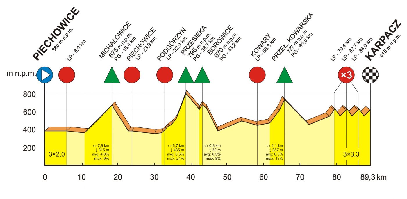 W związku z przejazdem zawodników ruch na ulicach: Kowarska, Konstytucji 3 Maja, Nadrzeczna, Kolejowa zostanie wstrzymany w godzinach od 17:15 do 18:05. Zawodnicy po wjeździe do Karpacza mają do pokonania trzy okrążenia (ul. Konstytucji 3 Maja, ul. Nadrzeczna, ul. Kolejowa), koniec I i premia lotna godz. 17:51,