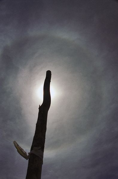 Halo, którego przyczyną jest załamanie promieni świetlnych w kryształach, jest zawsze z lekka zabarwione odcieniami tęczowymi.